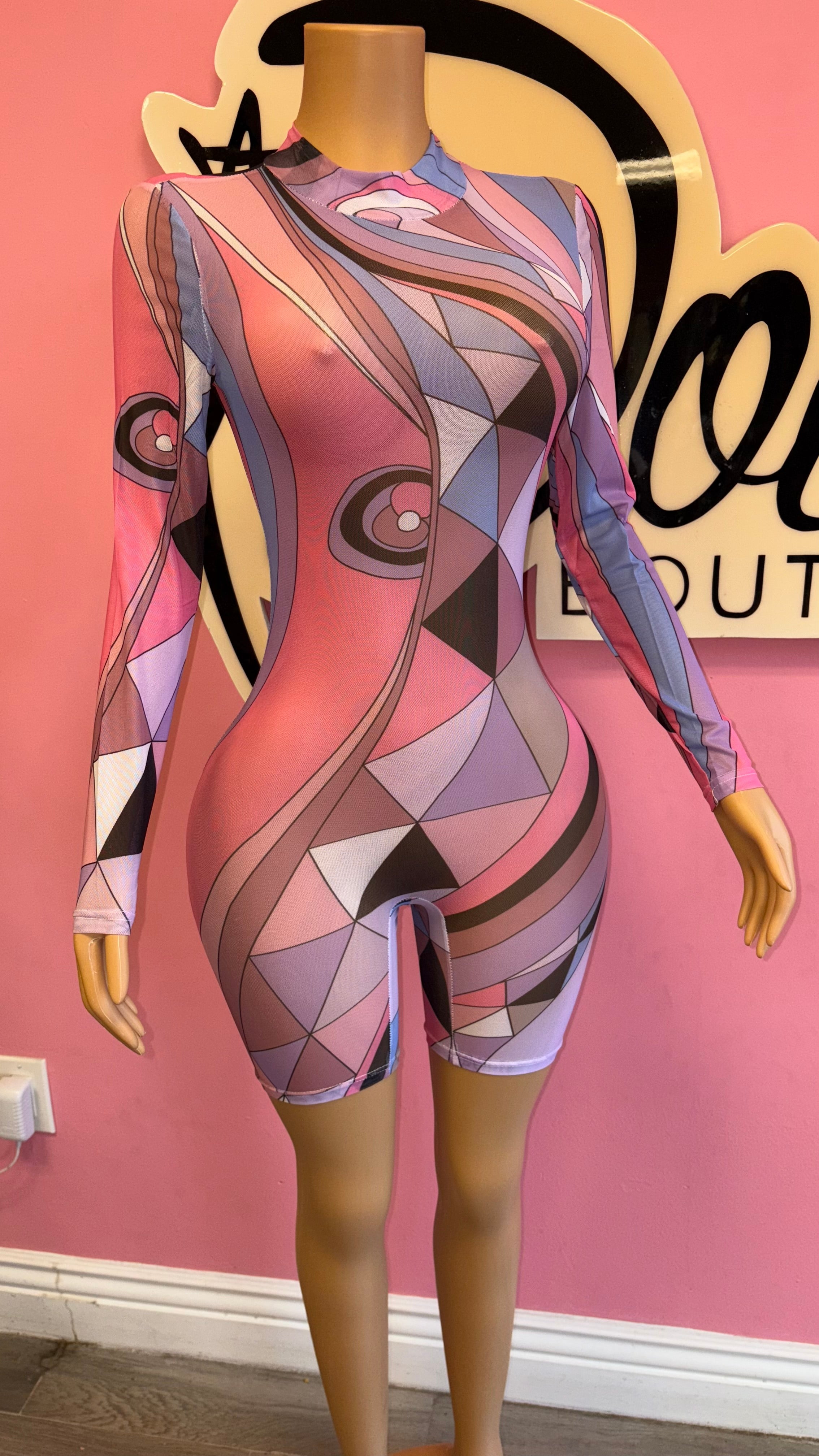 Step into a bold and artistic look with the Abstract Vision Mesh Romper, a sleek and stylish statement piece. Featuring a geometric-inspired print in shades of pink, lavender, and black, this body-hugging romper delivers a futuristic and edgy vibe. The long sleeves balance the daring fit, while the sheer mesh fabric adds a sultry touch. Perfect for a night out, festival look, or fashion-forward streetwear moment—pair with clear heels or bold accessories for a head-turning ensemble! Great stretch true to size