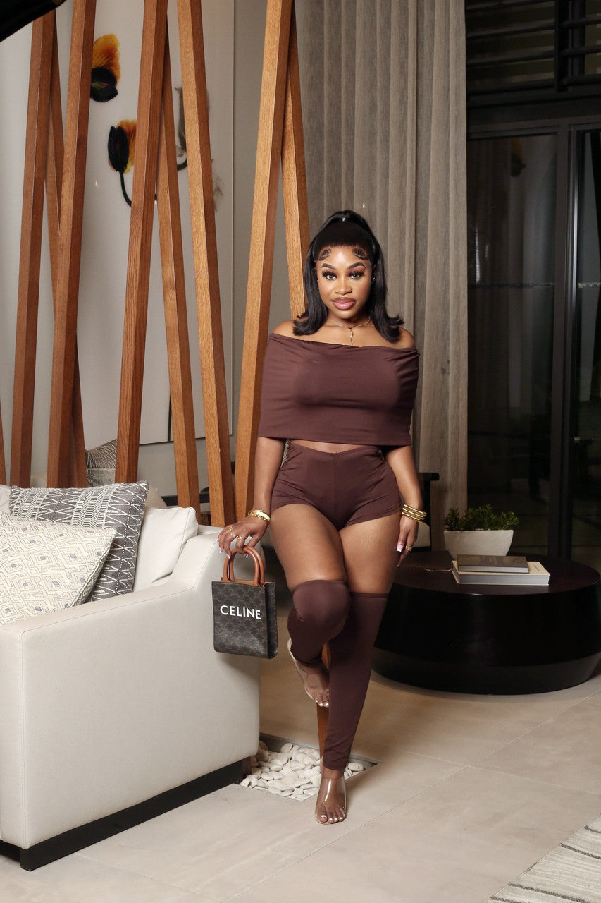 This sleek chocolate-brown ensemble serves fierce confidence with a minimalist edge. Featuring an off-the-shoulder crop top, matching high-waisted shorts, and coordinating thigh-high stockings, the look perfectly balances sultry and chic. The rich mocha tone flatters the skin, while the fitted silhouette accentuates every curve. Styled with clear heels and a classic CELINE mini tote, this outfit is ideal for a fashion-forward night out, luxe dinner, or any event where bold meets effortlessly elegant.