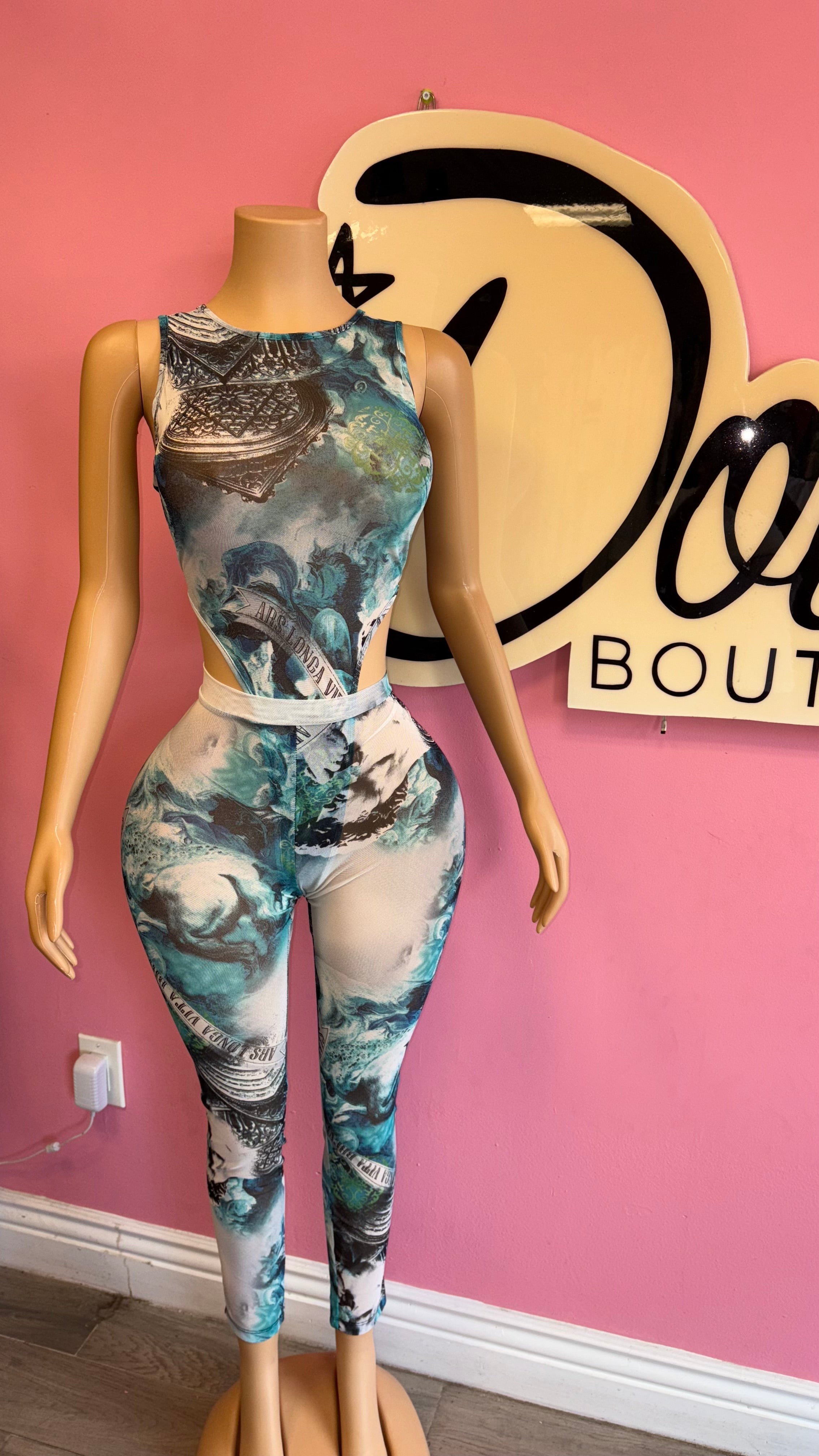 Step into a masterpiece with the Ethereal Vision Cutout Set, a striking two-piece ensemble that blends high-fashion artistry with a sultry silhouette. Featuring an abstract baroque-inspired print in dreamy shades of teal, white, and black, this set offers a luxe aesthetic with a modern twist. The sleeveless crop top boasts sleek side cutouts to enhance your waistline, while the high-waisted leggings sculpt your curves effortlessly. Perfect for a night out, upscale event, or making a bold fashion statement—pair with strappy heels and minimal accessories for an effortlessly chic look! Great stretch true to size