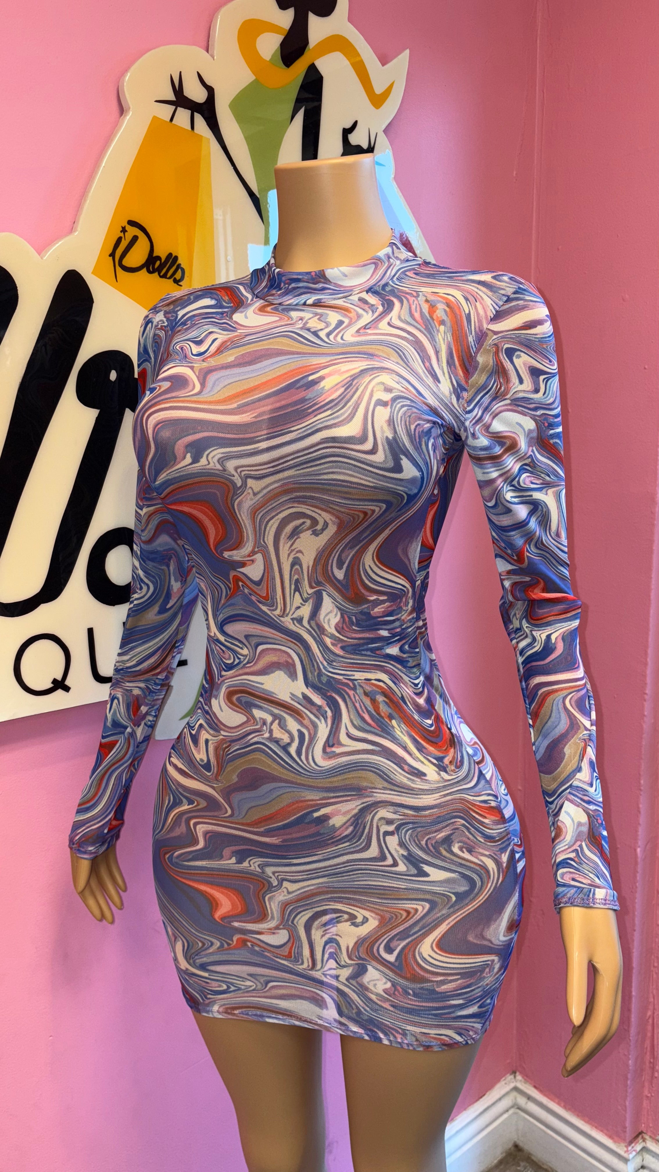 Make a mesmerizing statement in the Hypnotic Swirl Mesh Mini Dress, a bold and eye-catching piece designed to hug your curves in all the right places. Featuring a striking marbled print in shades of blue, orange, and white, this dress gives a dreamy, fluid effect that’s impossible to ignore. The sheer mesh fabric adds a sultry touch, while the long sleeves and bodycon fit create a sleek, sexy silhouette. Perfect for a night out, special events, or whenever you want to stand out in style. Pair with nude or metallic heels for a flawless finish! Mannequin wearing a medium Great stretch true to size