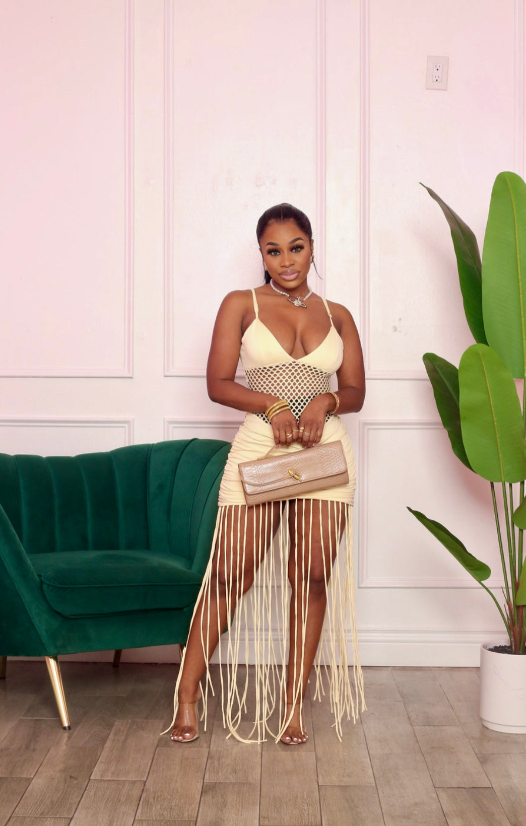 Turn heads and own the night in our Tangled in Temptation Dress. This sultry cream mini features a bold fishnet bodice that hugs every curve, ruching detail for a snatched silhouette, and fringe strands that flow with every step. Perfect for vacation, girls’ night out, or any moment you want to steal the spotlight.